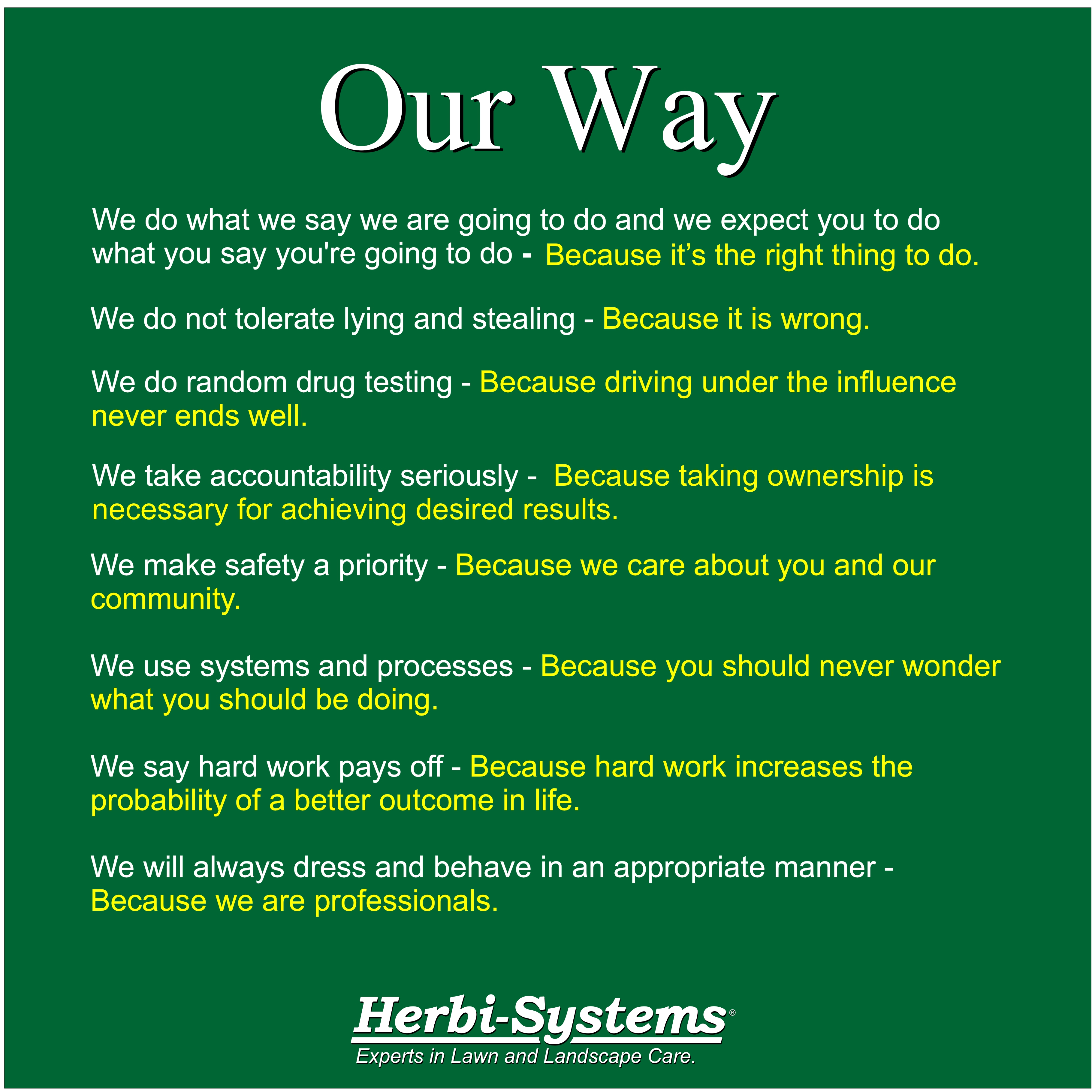 Our professionalism and impression on clients are important to us, so we'll always answer the phone and show up on time, in uniform, and equipped with everything we need to do our work. Not only that, but we also take pride in being a part of this community and giving back in any way we can, such as sponsoring events like golf tournaments, little leagues, and more.